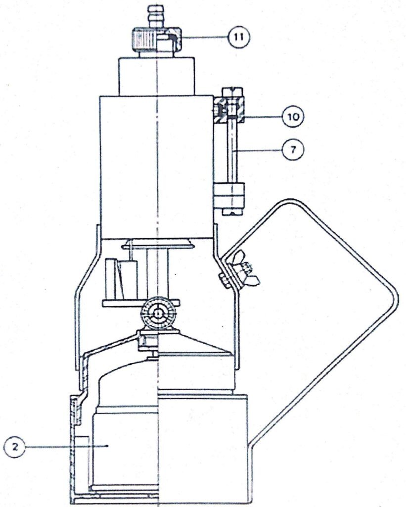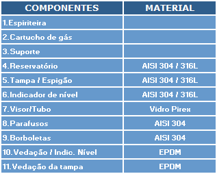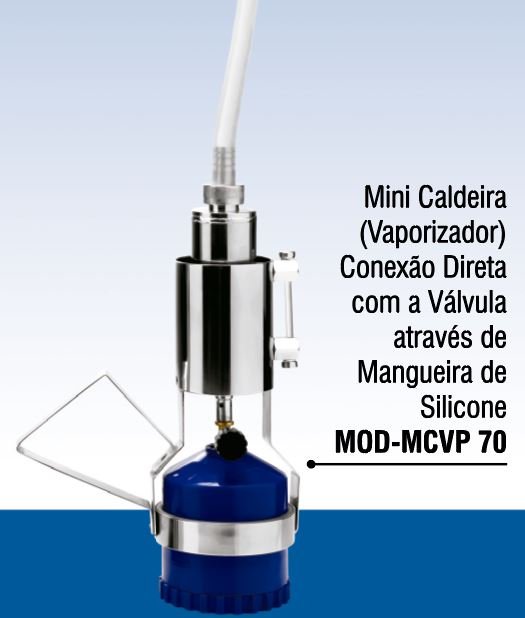 Mini-cal (Vaporizador para esterilização), esperiteira com botijão de gas descartável, suporte e reservatório em aço inox AISI-304, eletropolido internamente e externamente, conexão de saída espigão (Para tubo em silicone). Modelo MCVP-70
