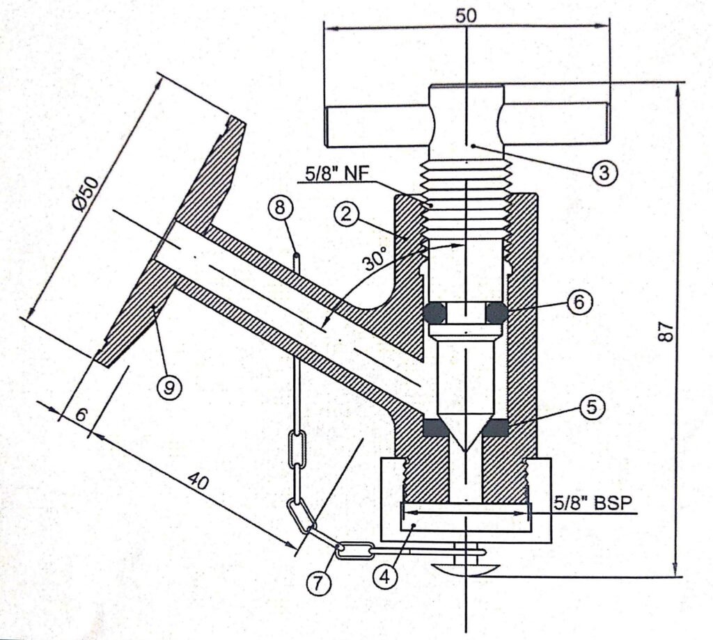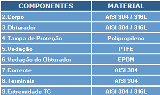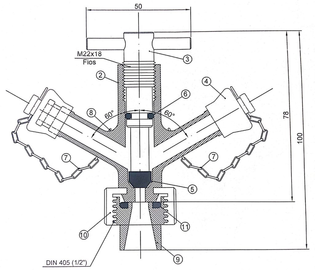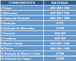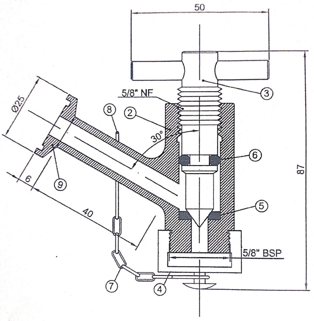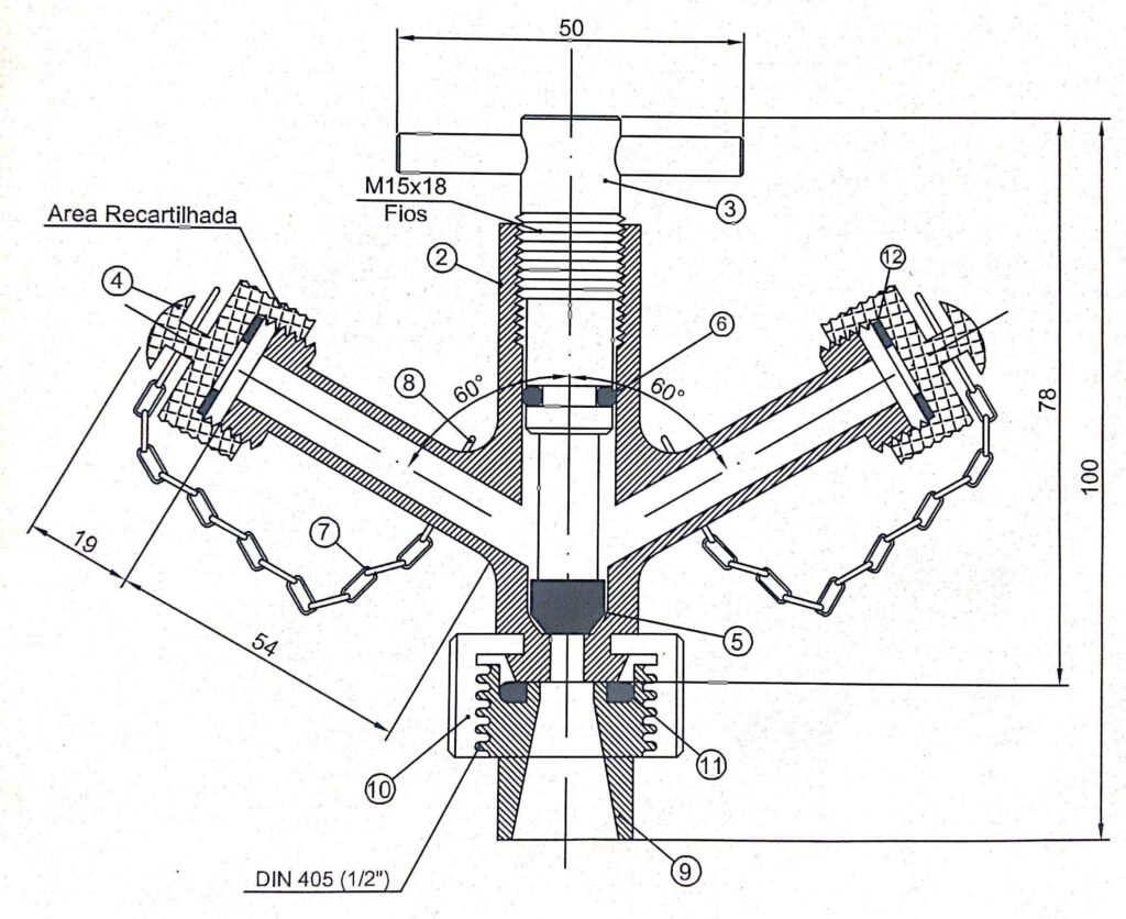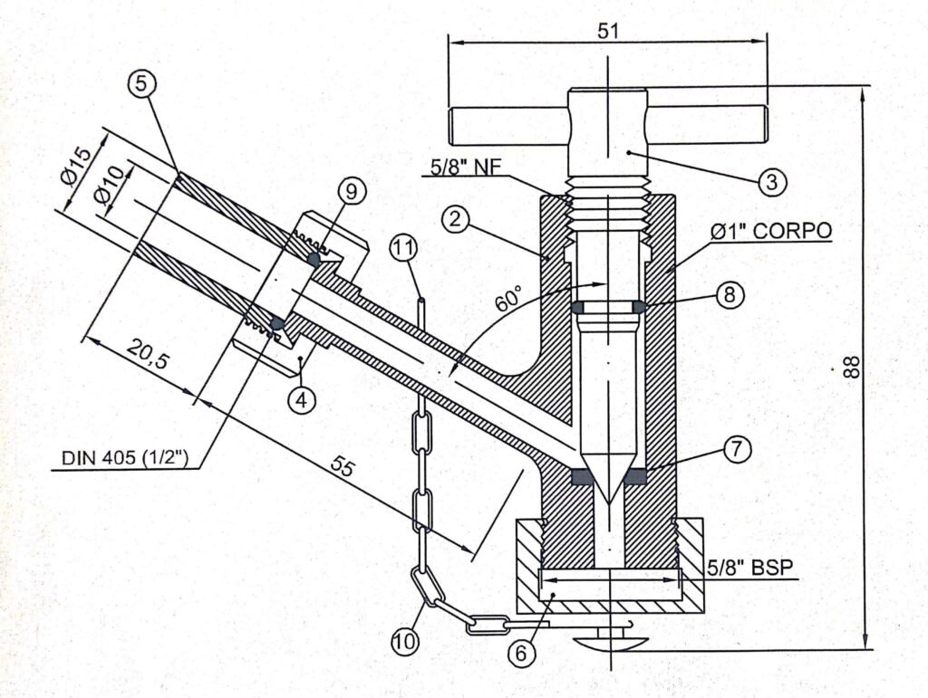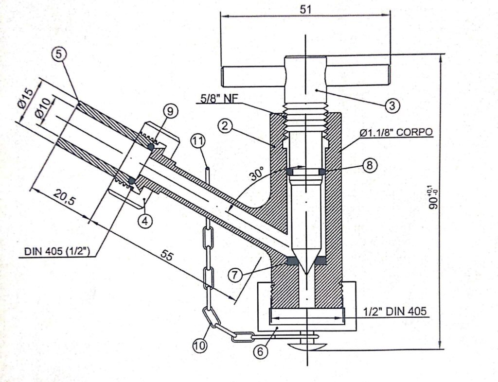 Válvula para coleta de amostra e macho para solda, específica para utilização em fermento. Em aço inox AISI-304 / 316L, polido externamente e eletropolido internamente vedações em (PTFE) puro e borracha grau alimentício, tampa de proteção em polipropileno (PP), com terminais e correntes em aço inox AISI 304 eletropolidos (Conexão saída DIN 405 1/2”. Modelo CAPB-51